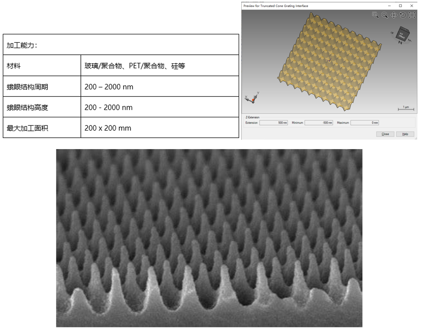 目前,我們采用納米壓印技術,可以在玻璃或塑料膜表面制作大面積的蛾眼結構,實現減反效果。在可見光范圍內可以將材料表面的反射率降低到小于0.2%。在紅外波段,結合納米壓印和等離子刻蝕工藝,可以在硅表面加工蛾眼結構來減少其對紅外光的反射。