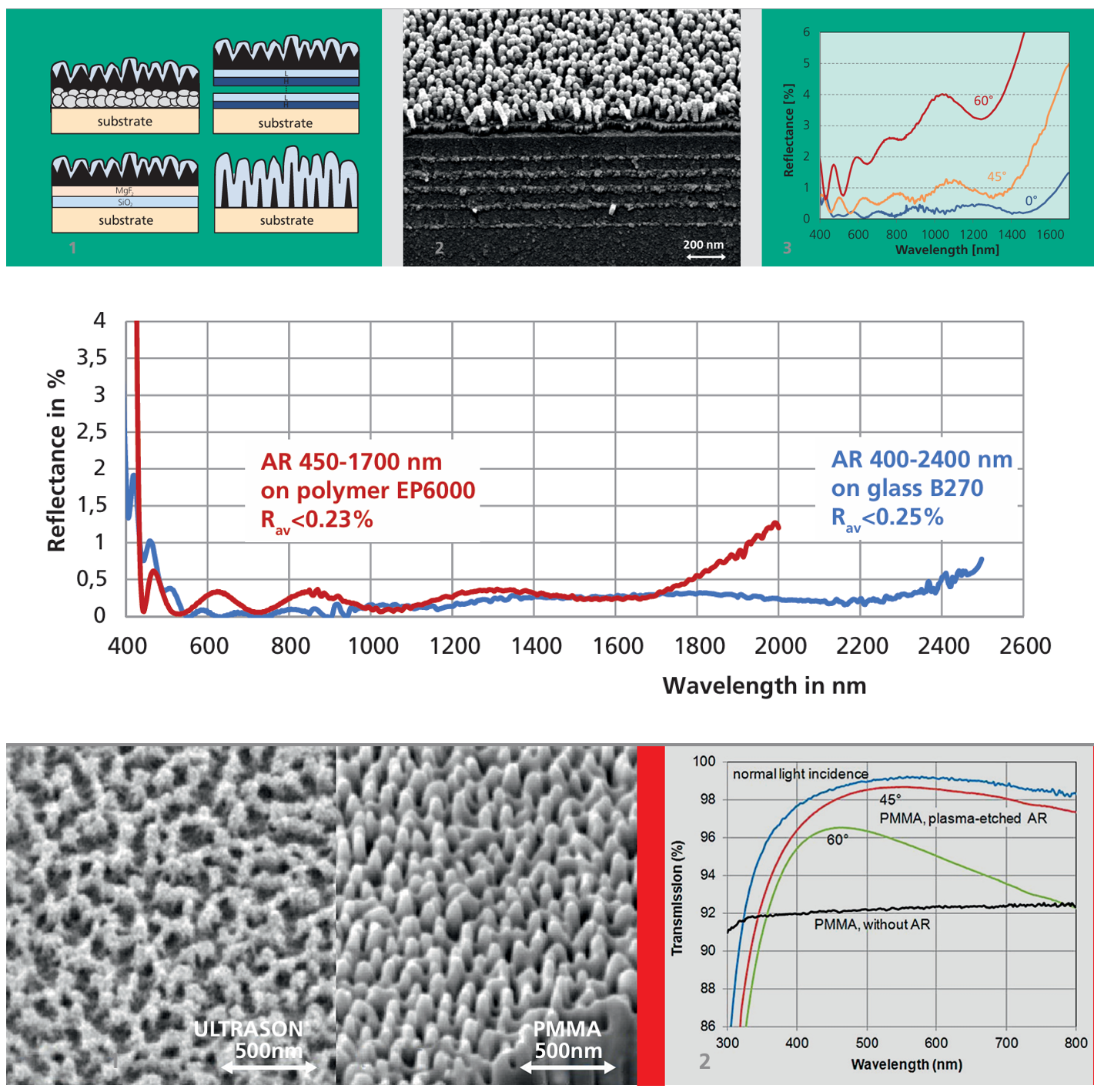 除了納米壓印技術外,訊技光電可以利用具有氣相沉積層和納米結構層相結合的技術,解決非常寬的光譜范圍和高入射角問題。根據需求我們可以優化該微納結構和膜層,使其適用于寬光譜范圍(300nm- 2500 nm)和入射角范圍(0° - 75°),并且可用于任何基材材料(包括塑料、玻璃和石英等)。