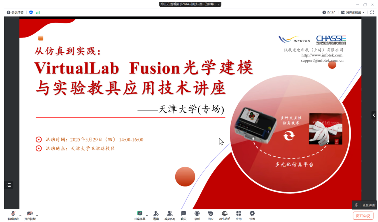 2025年5月29日下午,訊技光電攜手天津大學成功舉辦了一場以“從仿真到實踐:VirtualLab Fusion光學建模與實驗教具應用技術”為主題的講座。此次講座采用線下參與與線上直播結合的形式,吸引了眾多光學專業的師生,共同開啟了一場精彩的光學知識探索之旅。