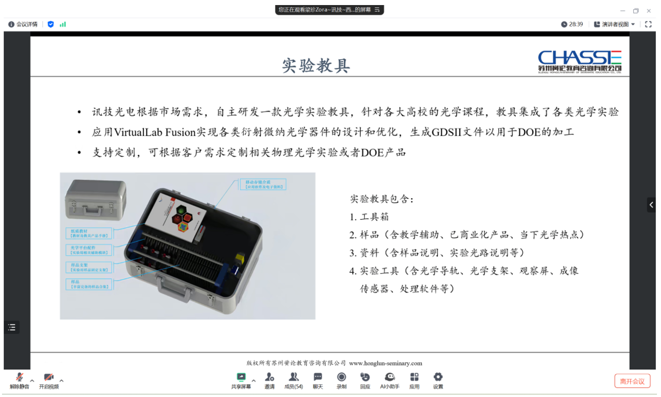 隨后,工程師詳細介紹了訊技自研的光學實驗教具與VirtualLab Fusion軟件。訊技自研的光學實驗教具是公司根據市場需求,精心研發的成果,它緊密結合教學與科研需求,針對各大高校的光學課程,集成了各類光學實驗,能夠幫助學生和科研人員更好地理解光學原理,提升實踐能力。