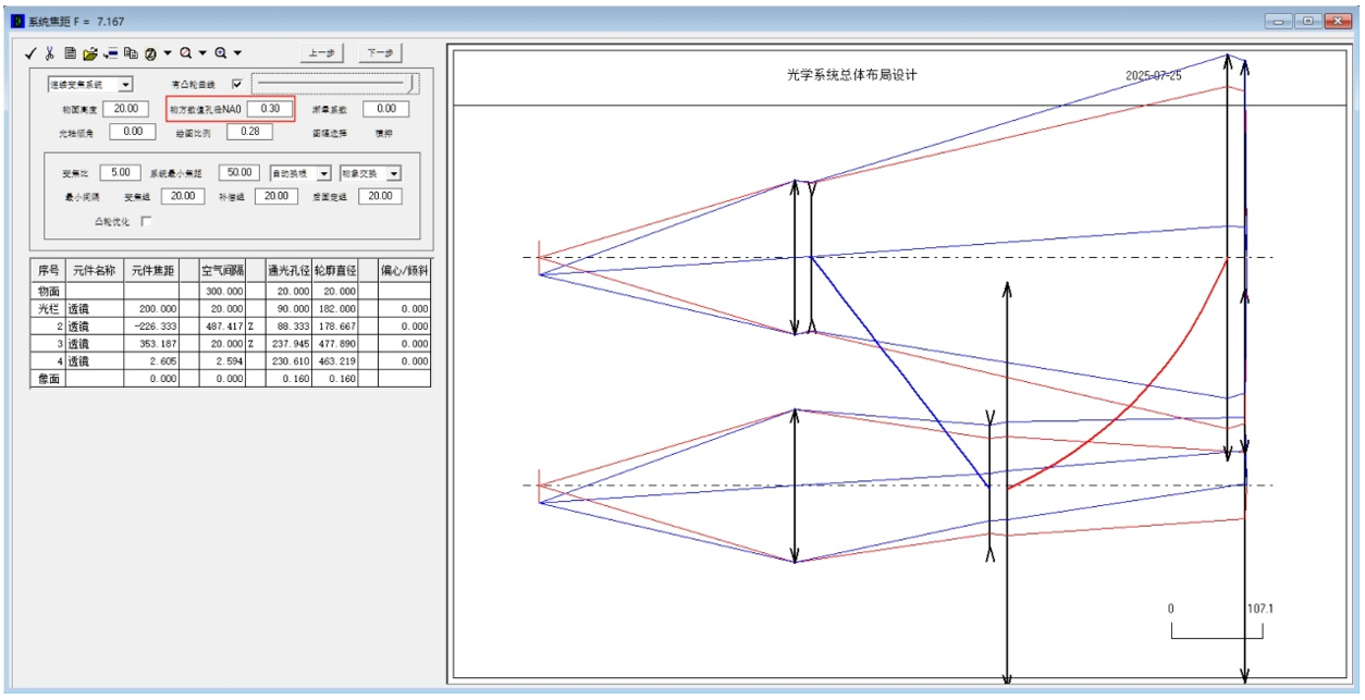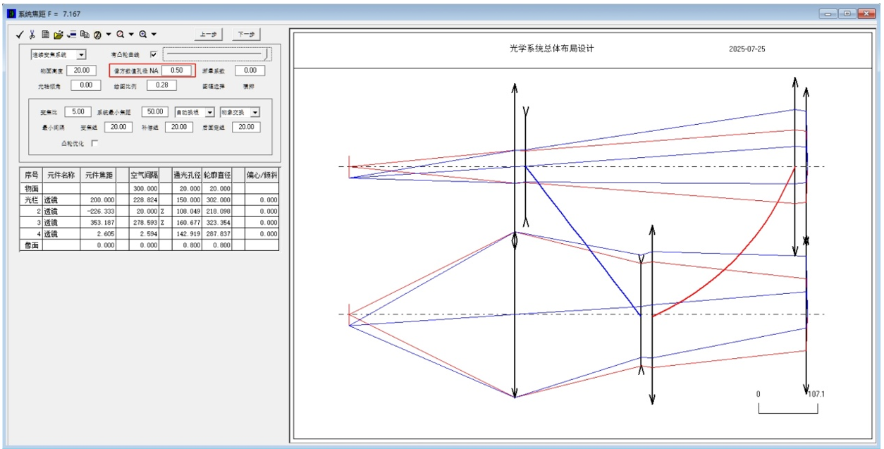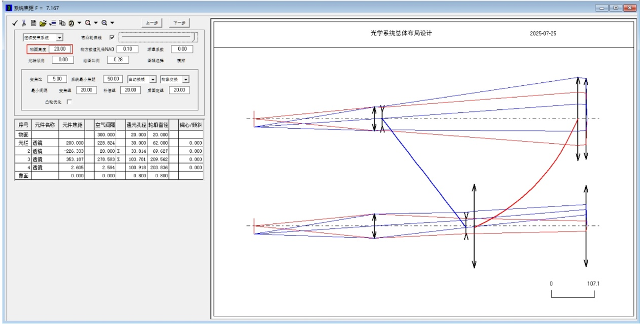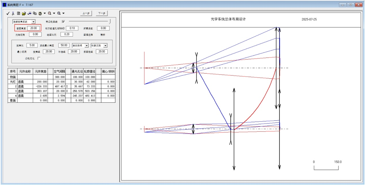 然后發現界面上顯示的不是系統焦距值,而是初始放大率值以及變倍比、物面高度、像面高度、物方數值孔徑NA0、像方數值孔徑NA0以及系統最小焦距等內容。