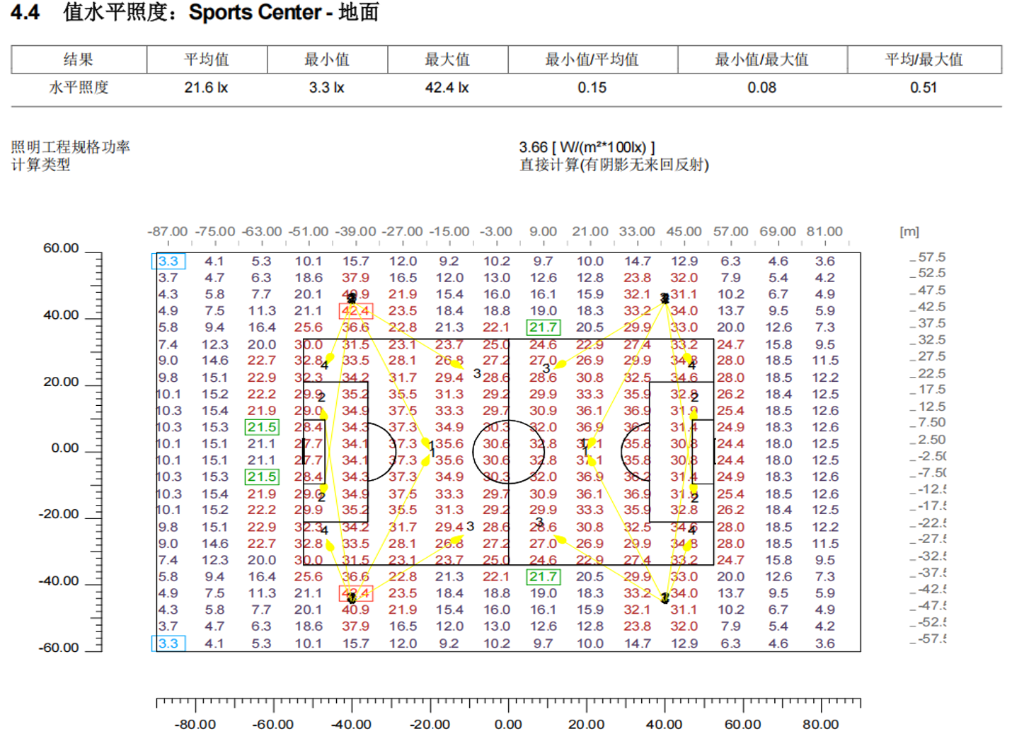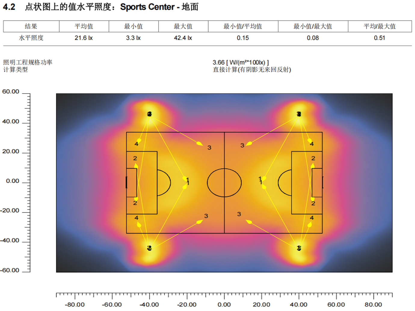 設計足球場面積合理,其中布置燈具擺放合理,符合照明標準。