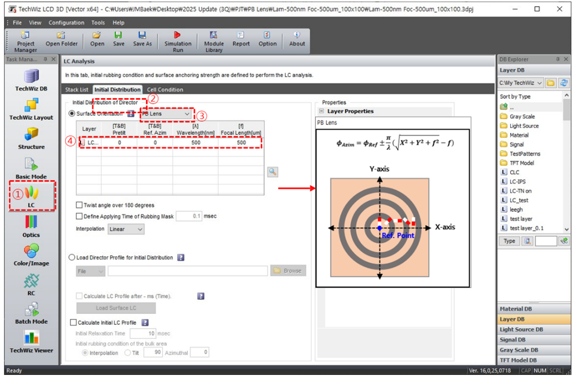 c) ①加載項目文件并選擇LC選項卡→ ②初始分布→ ③選擇平面光柵的表面方向→ ➃設置表面方向