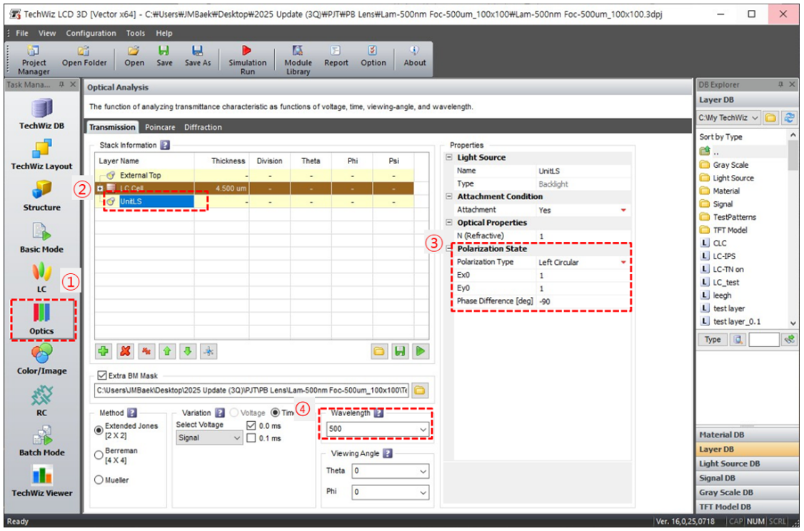 d) ①選擇光學選項卡→ ②疊加光源→ ③設置偏振類型(左旋圓偏光)→ ➃ 設置波長