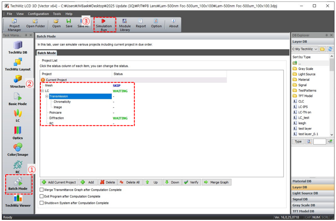 f) ①選擇批處理模式→ ②設置狀態→ ③ 運行仿真