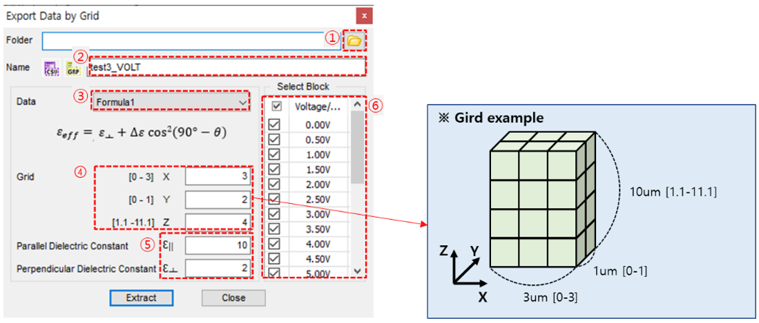 c) ①設置文件保存路徑→ ②設置文件名→ ③選擇有效介電常數公式→ ➃設置網格(劃分數)→ ⑤設置LC介電常數→ ⑥選擇電壓或時間