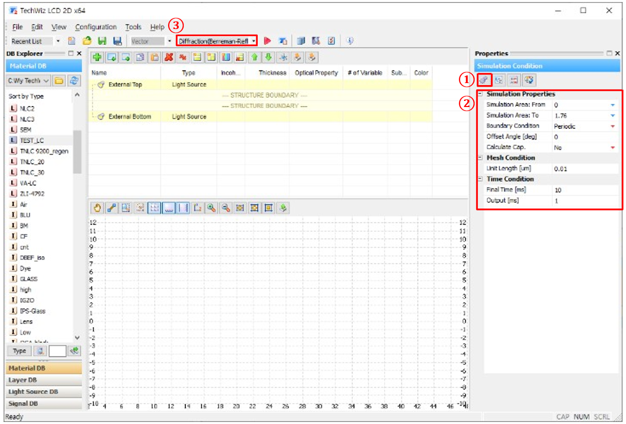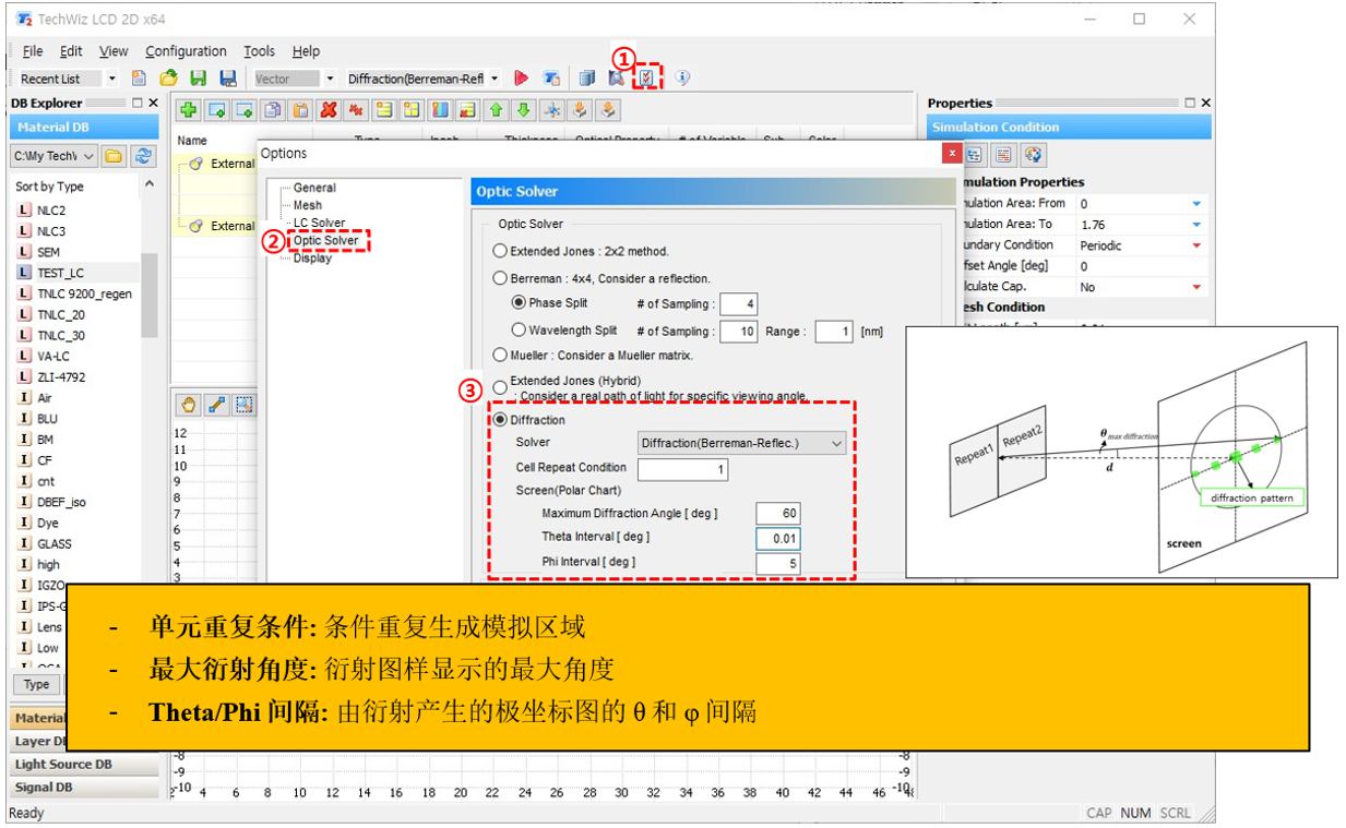 a) ① 仿真條件→  ② 設置仿真屬性 →  ③ 選擇光學求解器 (Diffraction(Berreman Reflec.))