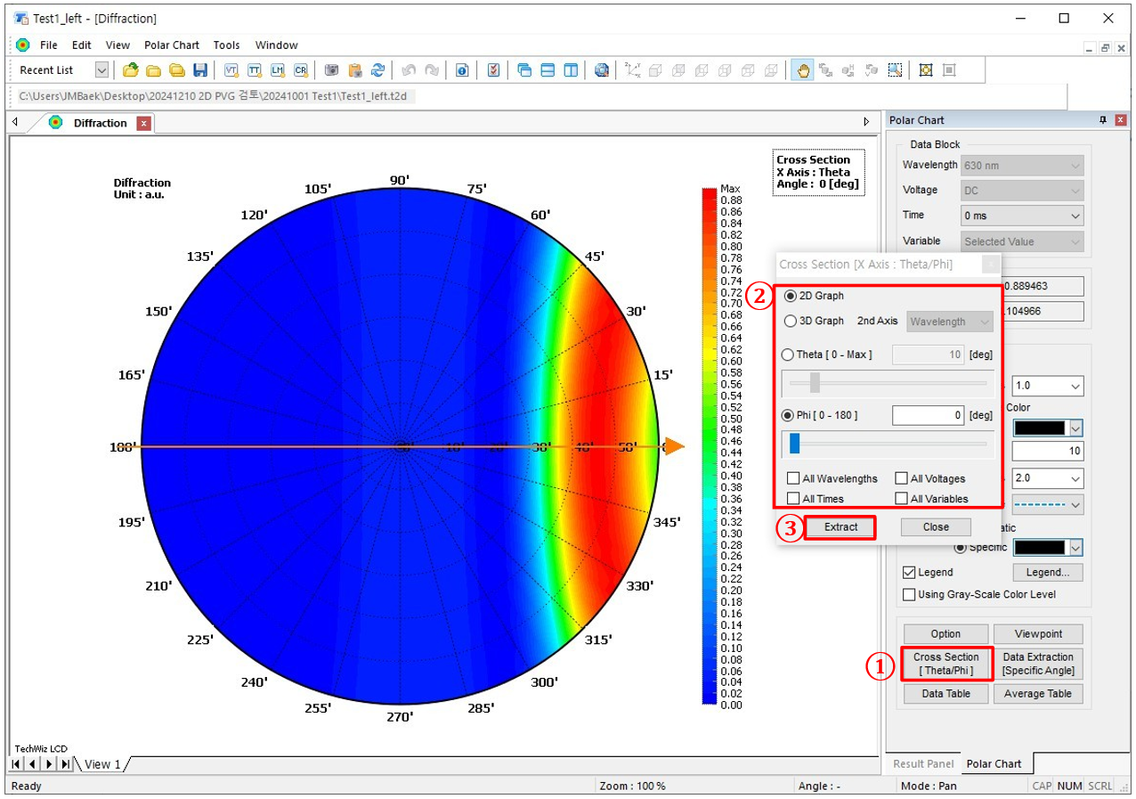 g) ①極坐標圖→ ②選擇顯示(反射)→ ③ 選擇數據(衍射)→④ 繪制