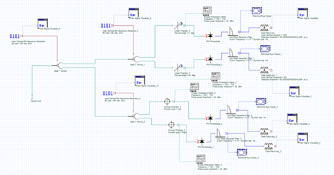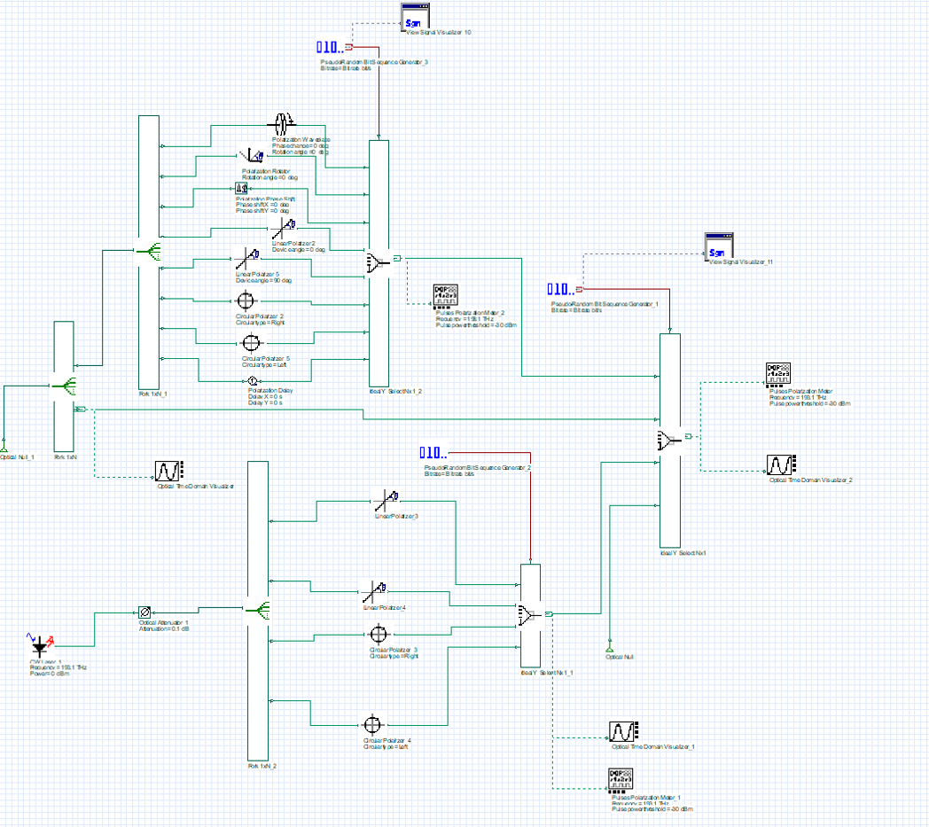 在上圖中,我們配置了連續波光源(CW激光器),并通過衰減值為0.1的光衰減器實現單光子量級輸出。系統設置了四種偏振片:水平、垂直、左對角和右對角偏振片。通過"Select"組件隨機選取四種偏振角度之一生成量子比特。