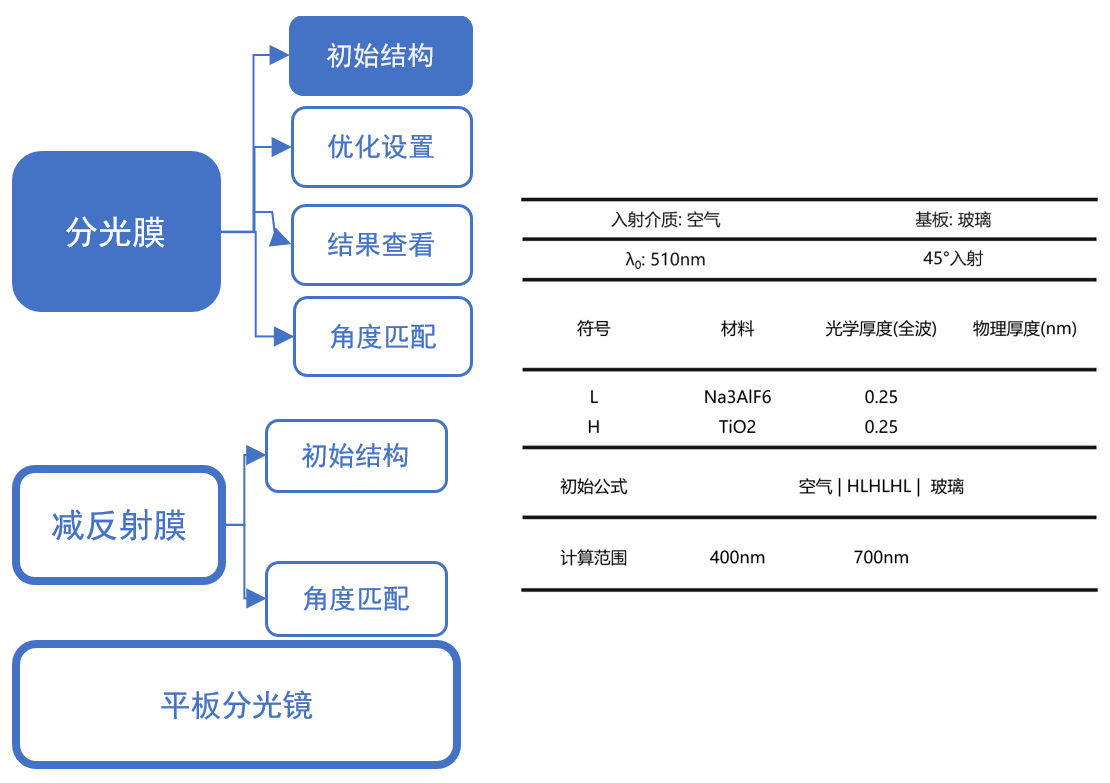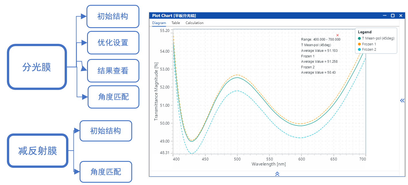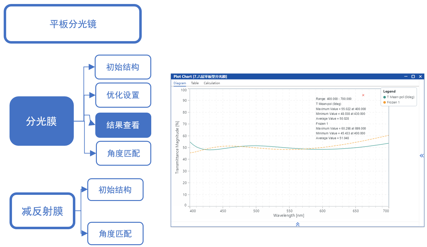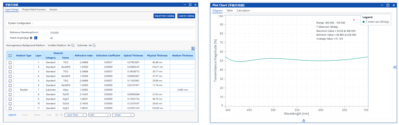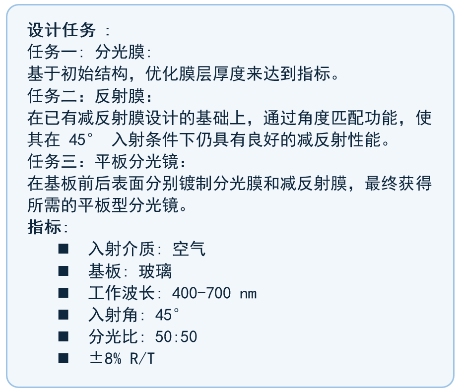 設計一個平板分光鏡,包含一個分光膜和一個減反射膜。使其在可見光范圍內、45° 入射條件下實現 50:50 的分光比。平均透射率或平均反射率的偏差不得超過 ±8%,即應控制在 42%–58% 范圍內。