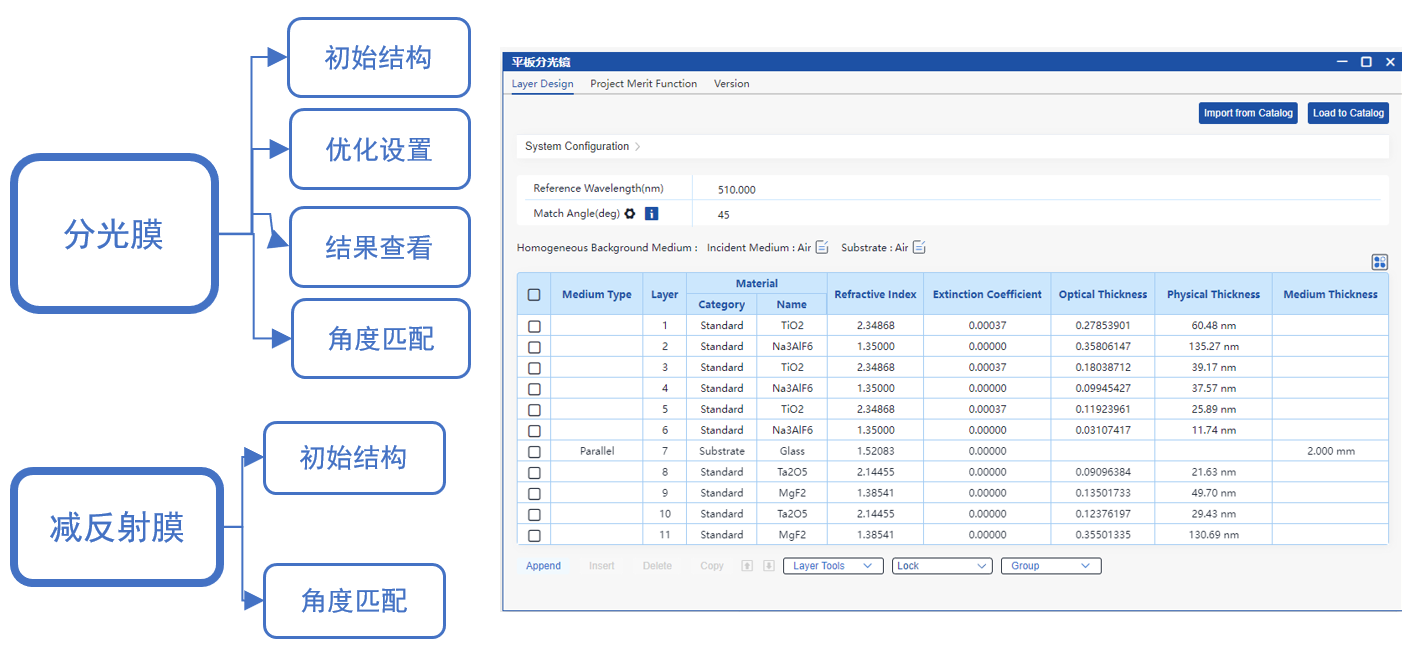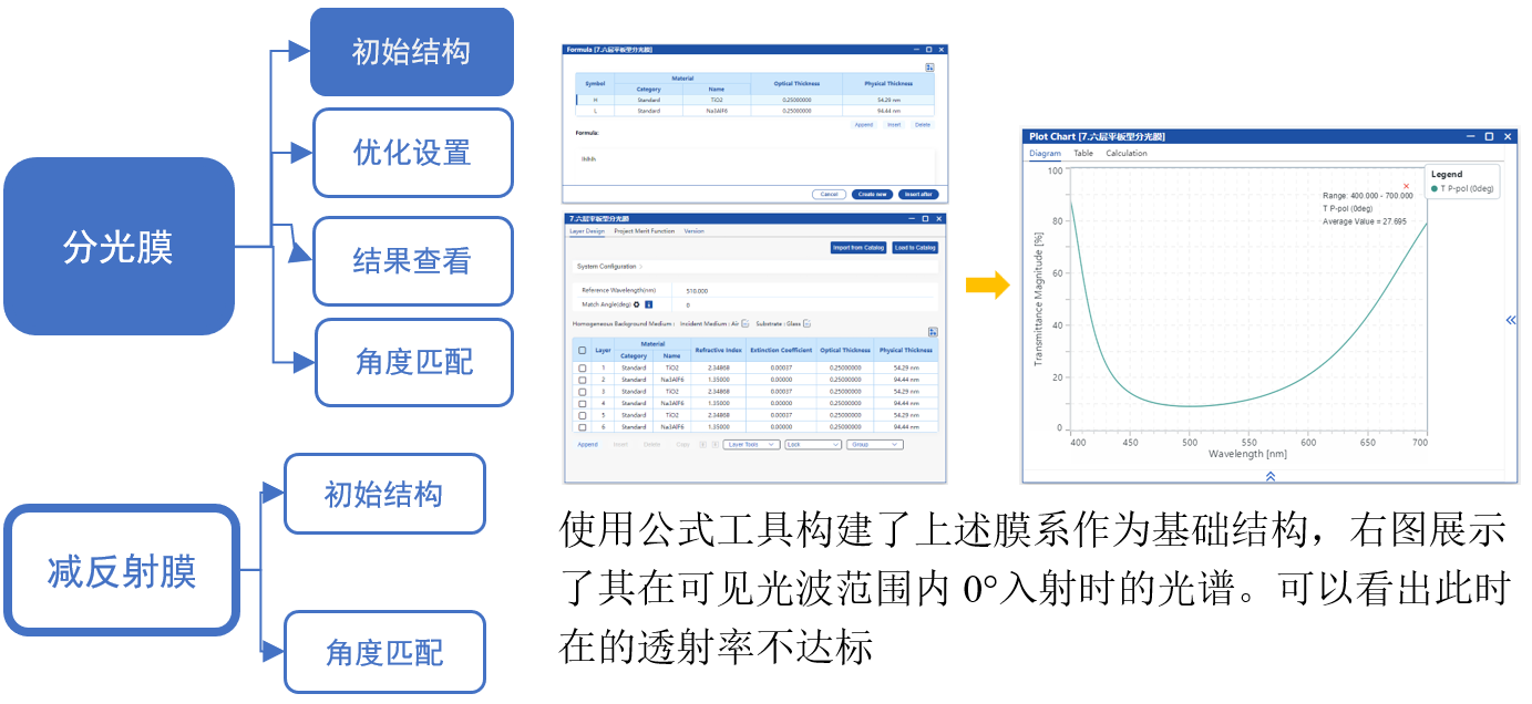 使用公式工具構建了上述膜系作為基礎結構,右圖展示了其在可見光波范圍內0°入射時的光譜。可以看出此時在的透射率不達標
