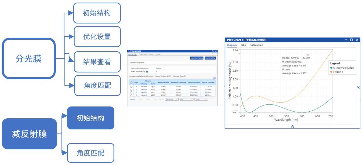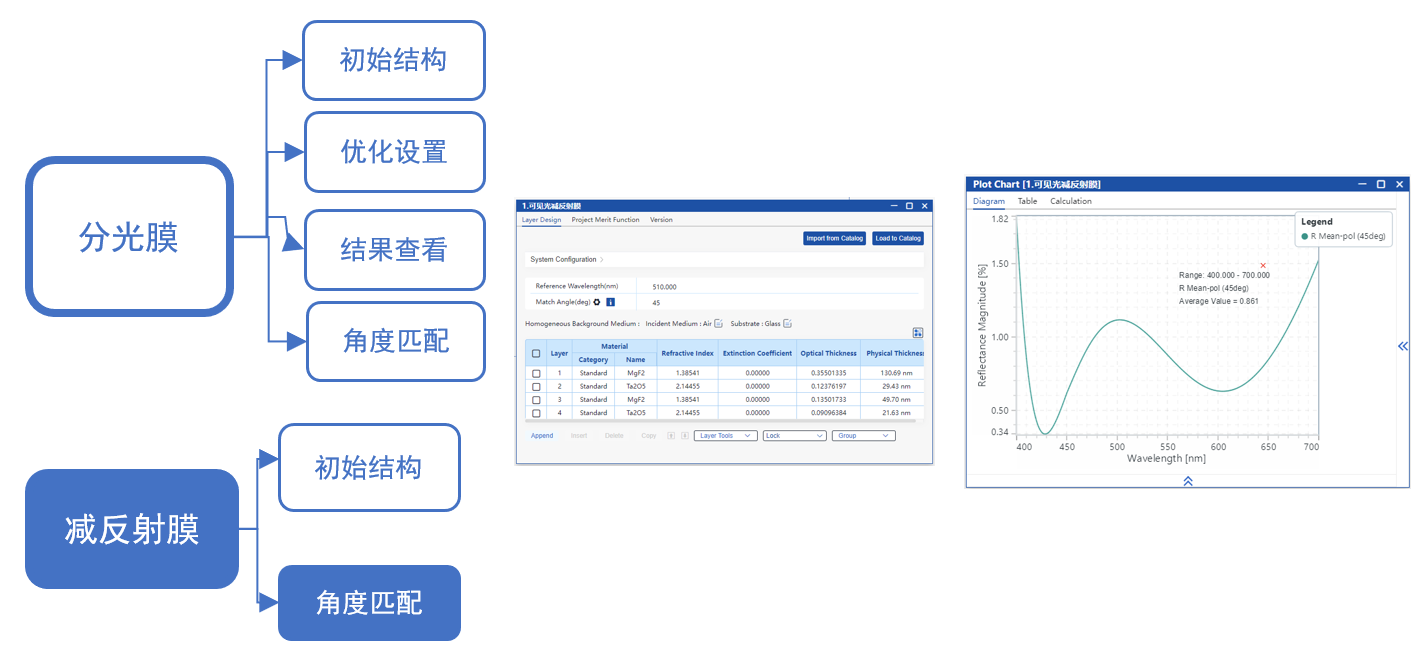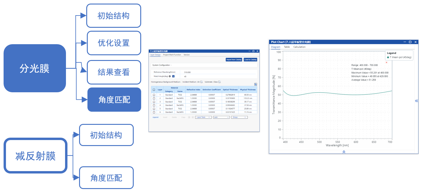 之前分光膜的設計基于理想情況,未考慮實際鍍制在平板上所引入的額外反射。因此,需要在平板背面增加減反射膜以降低反射率。本設計中使用了已優(yōu)化的可見光減反射膜。然而,由于該減反射膜是針對 0° 入射角優(yōu)化的,在 45° 入射條件下(黃色虛線)減反效果較差,因此后續(xù)仍需進行角度匹配優(yōu)化。