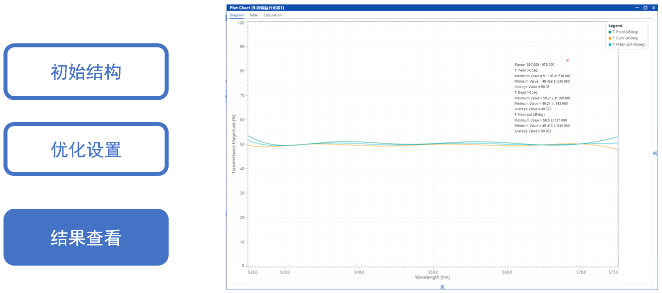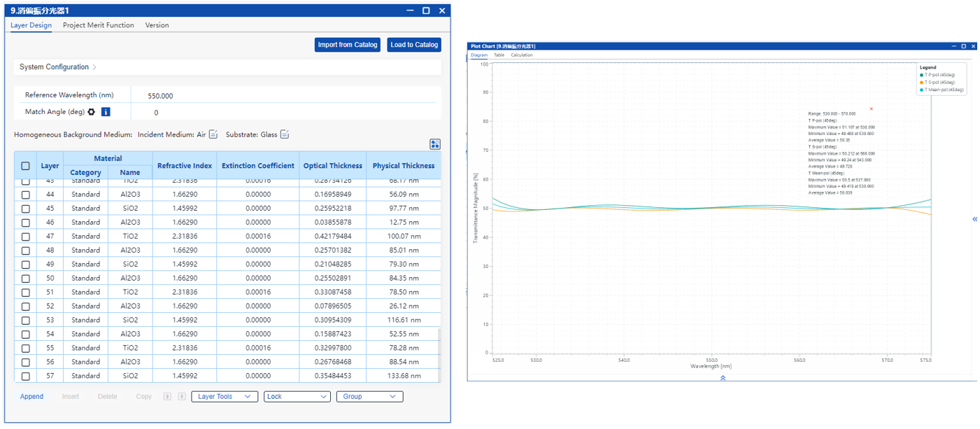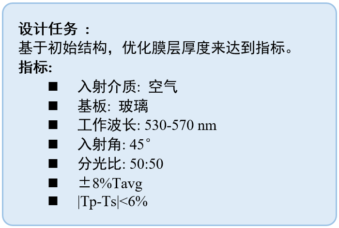 設計一款消偏振分光膜,在45°入射條件下,于530–570 nm波段實現50:50的分光比。要求該波段內的平均透射率偏差不超過±8%,且p光與s光的平均透射率之差的絕對值小于6%。