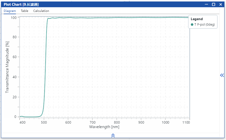 在本應用案例中,選用常規的對稱周期膜系作為初始設計,并通過優化膜層厚度,成功設計出一種截止波長為 400–490 nm、通帶為 515–1100 nm 的長波通濾光片。
