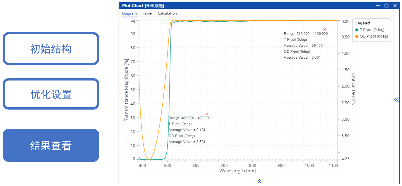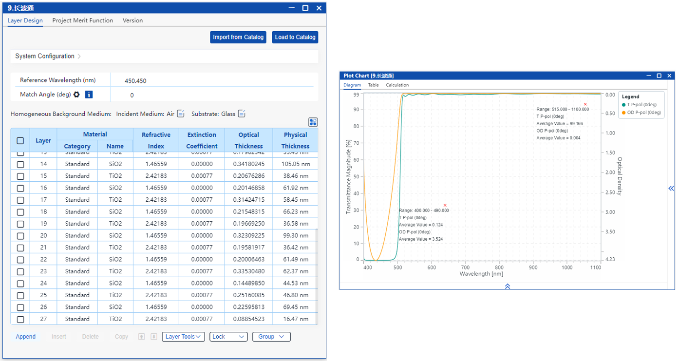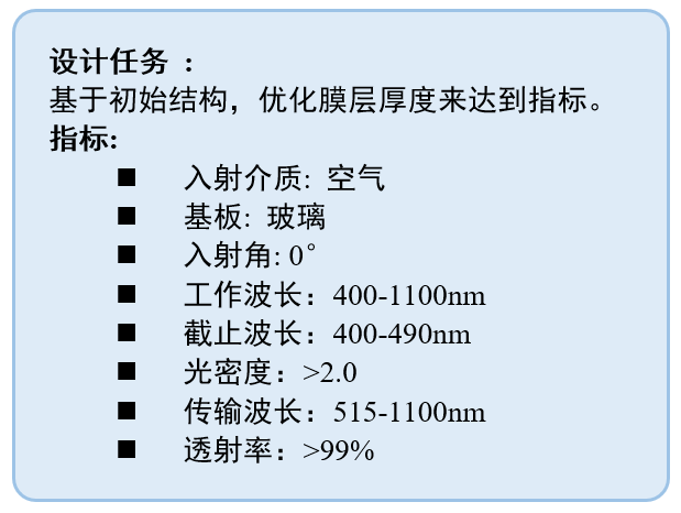 通過優化初始結構的厚度,目標是在0°入射時,400-490 nm截止,平均光密度>2。515-1100nm透過,平均透射率>99% 。