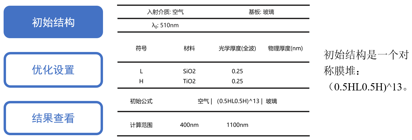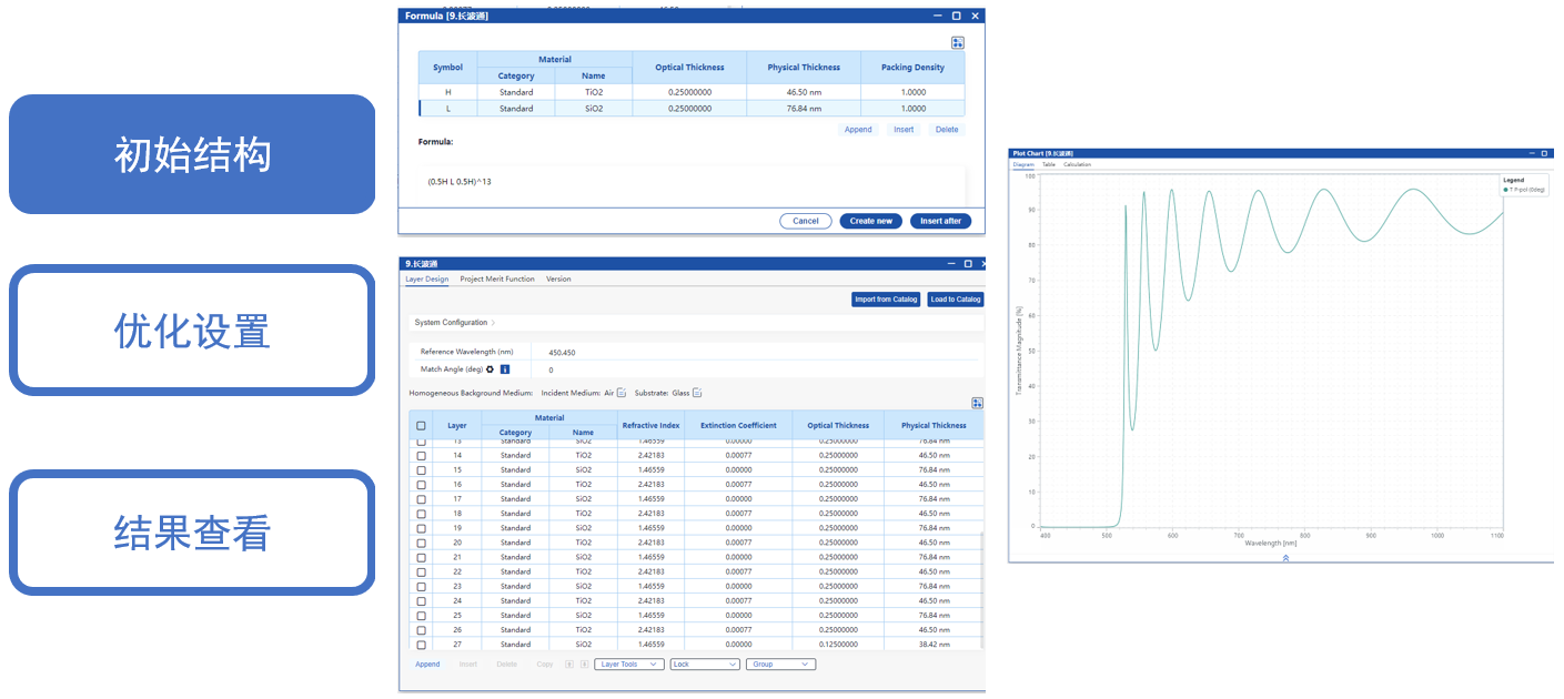 使用公式工具構建了上述膜系作為基礎結構,右圖展示了其在400-1100 nm內0°入射時的光譜。可以看出此時在的透射波段有很多的波紋。