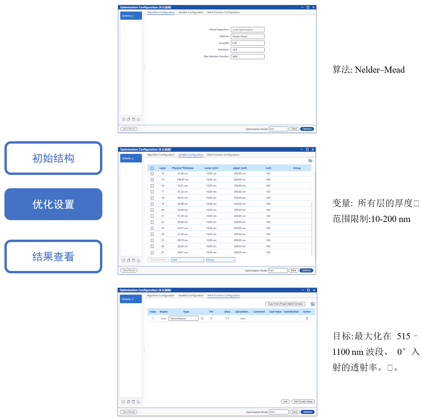 采用 Nelder-Mead 算法對各層厚度進行優化,目標是在 400–1100 nm 波長范圍內、0° 入射時最大化平均透射率。