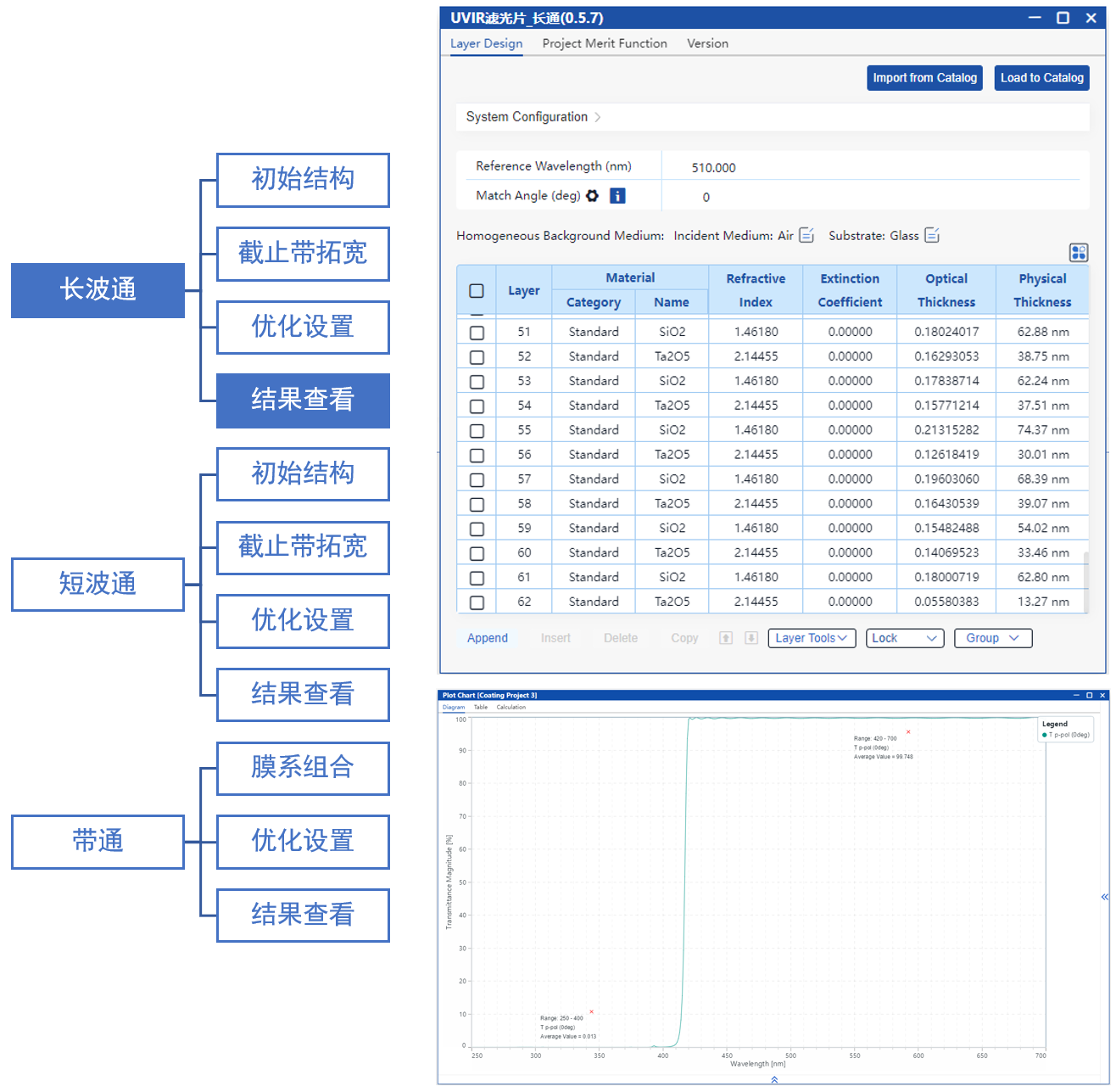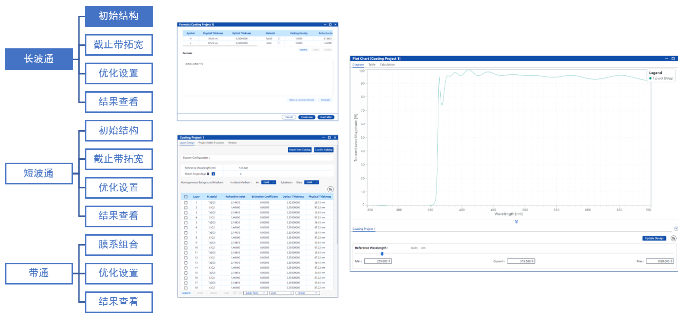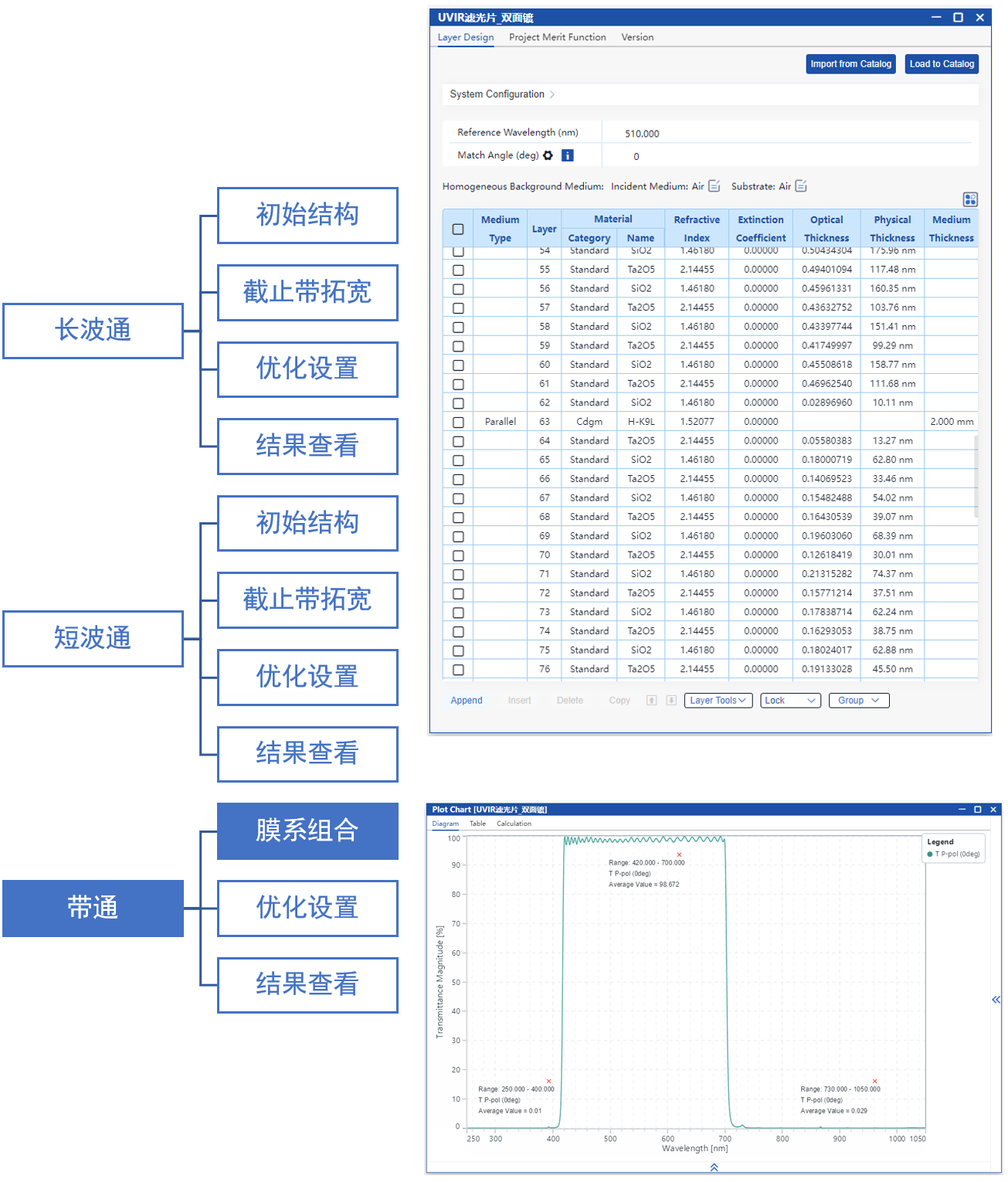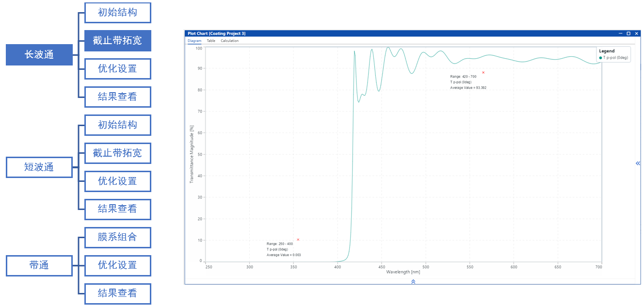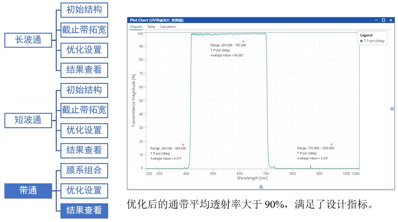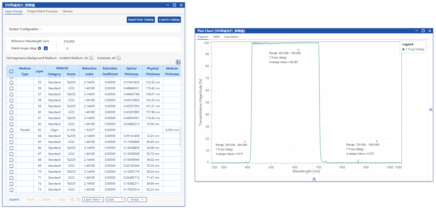 在本案例中,我們采用將長波通與短波通濾光片分別設計并鍍于鏡片兩側的方式,并在此基礎上進行整體膜系優化,最終實現了一個帶通濾光片,在420–700 nm波段內具有高透過率,在250–400 nm與730–1050 nm波段具備高截止能力。