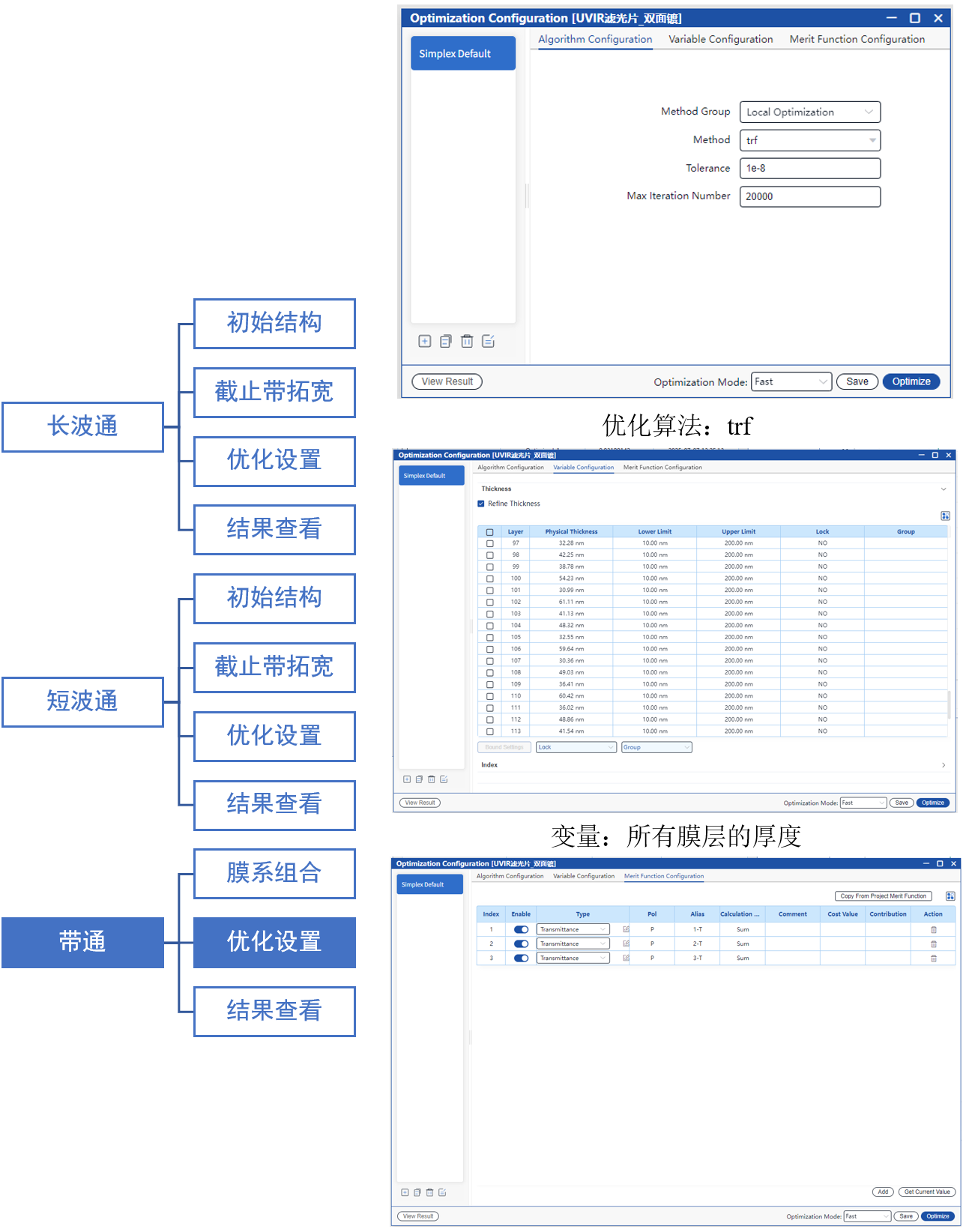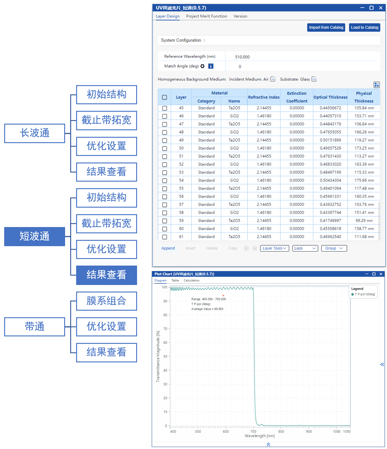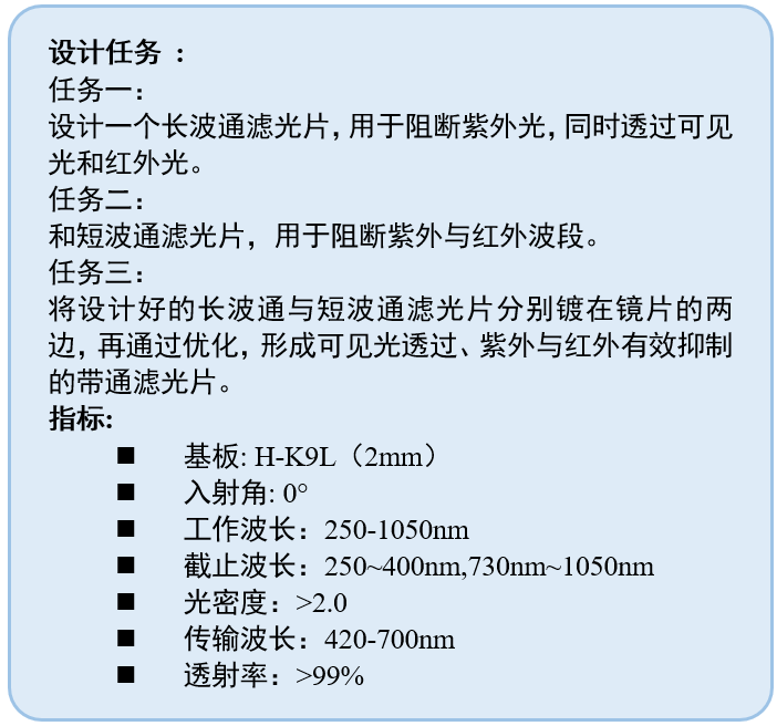 使用trf算法優化基板前后所有膜層的厚度,目標是在截止帶透射率接近0%,通帶透射率接近100%。