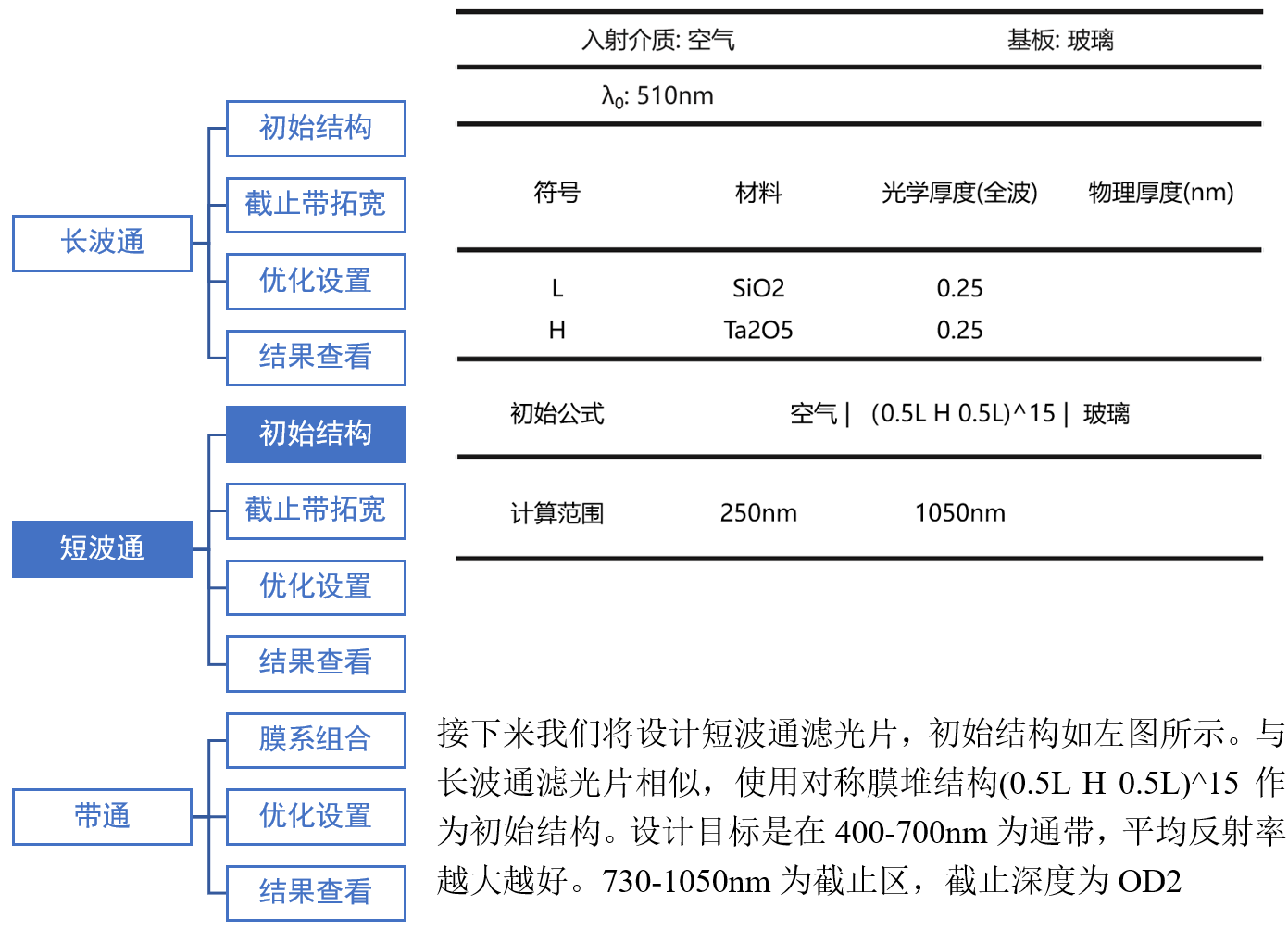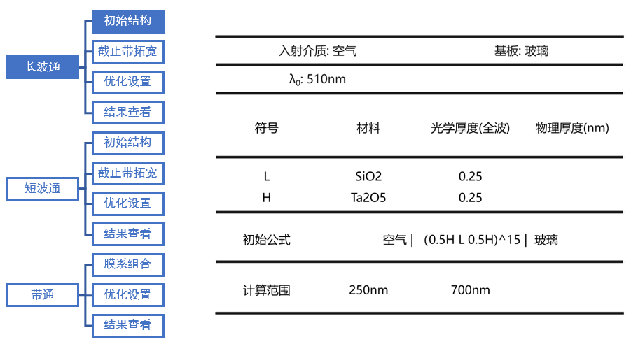 首先進行長波通濾光片的設計,初始結構如左圖所示。使用常用的對稱膜堆結構(0.5H L 0.5H)^15作為初始結構。設計目標是在250~400nm為截止區,截止深度為OD2。420-700nm為通帶,平均反射率越大越好。