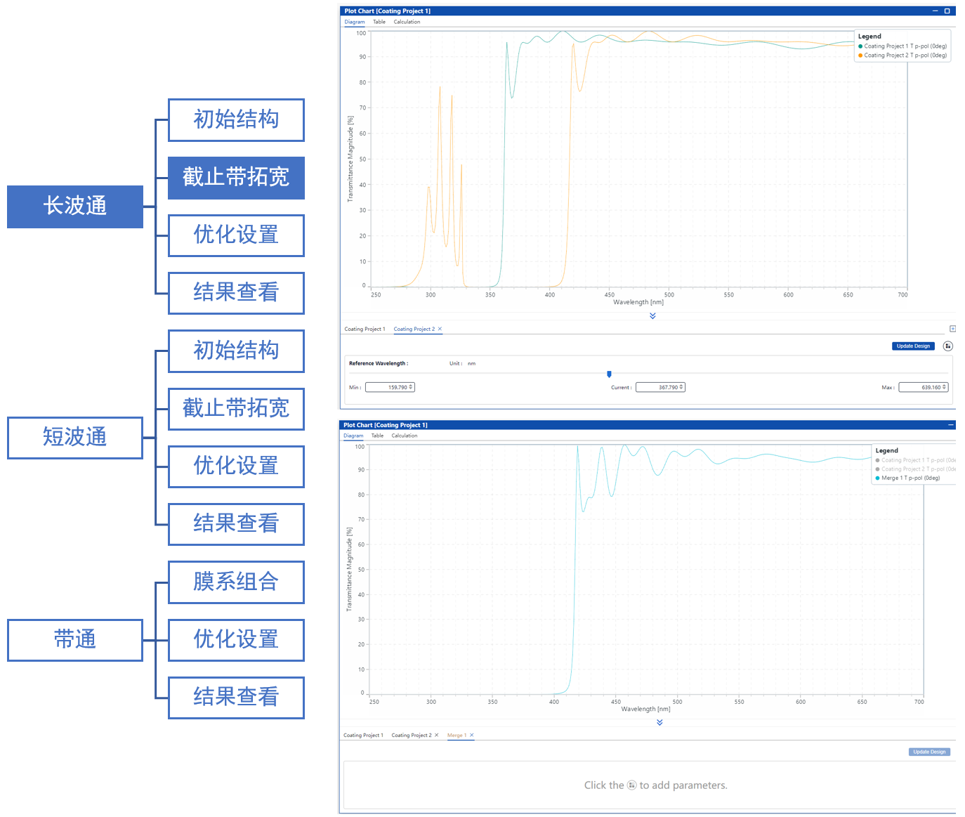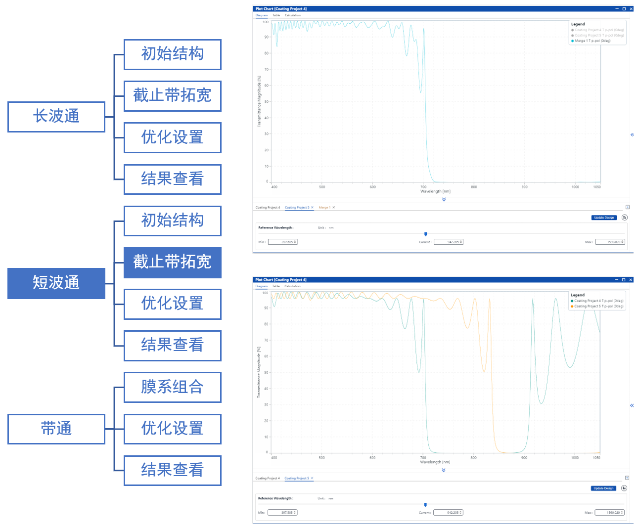 軟件可將兩個參考波長不同的膜系繪制于同一光譜圖中(見左圖),并通過項目合并功能預覽合并后膜系的光譜響應(見右圖)。