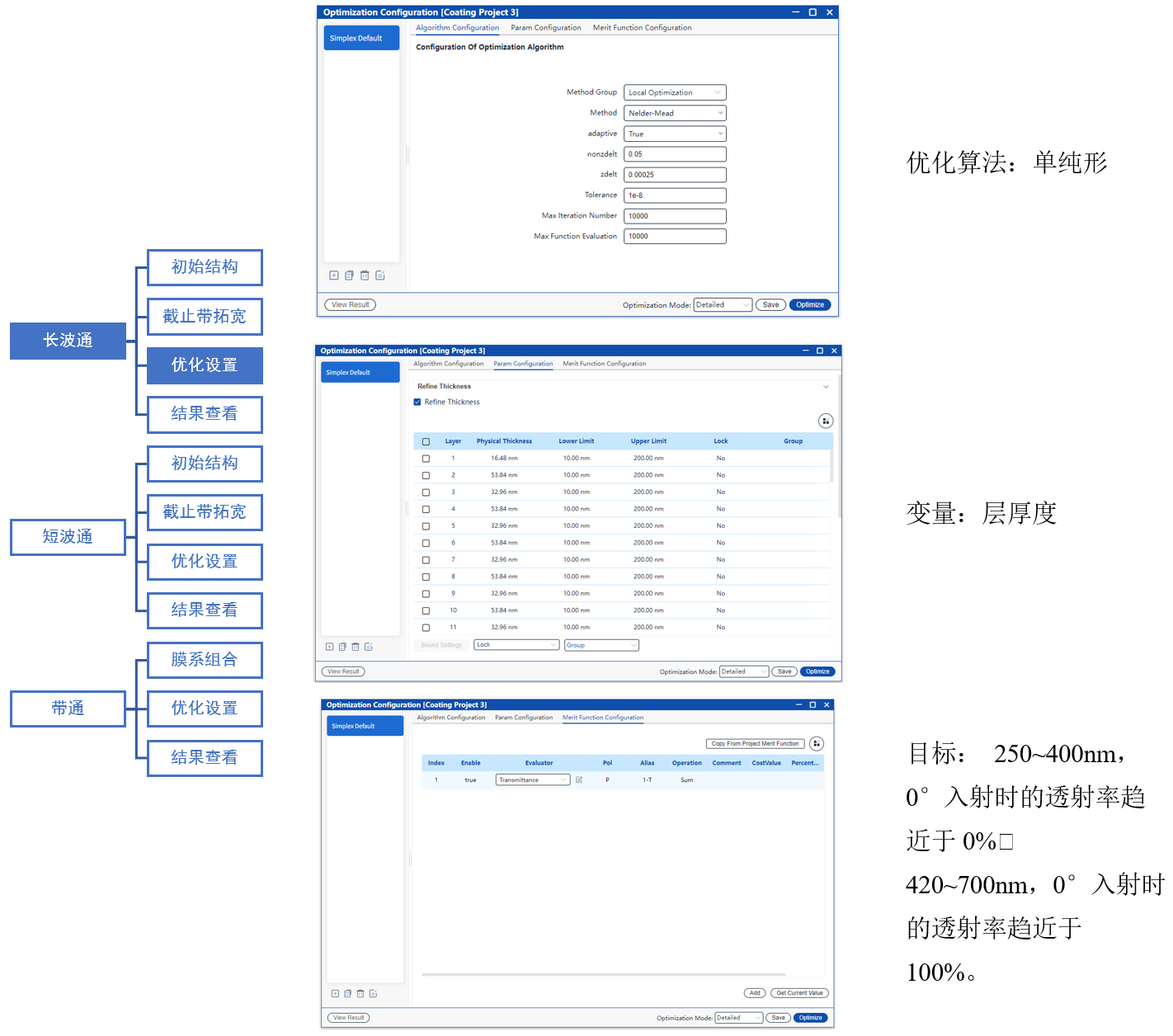 使用Nelder-mead算法優化各層厚度,目標是250~400nm波段透射率趨近于0%,420~700nm波段透射率趨近于100% 。