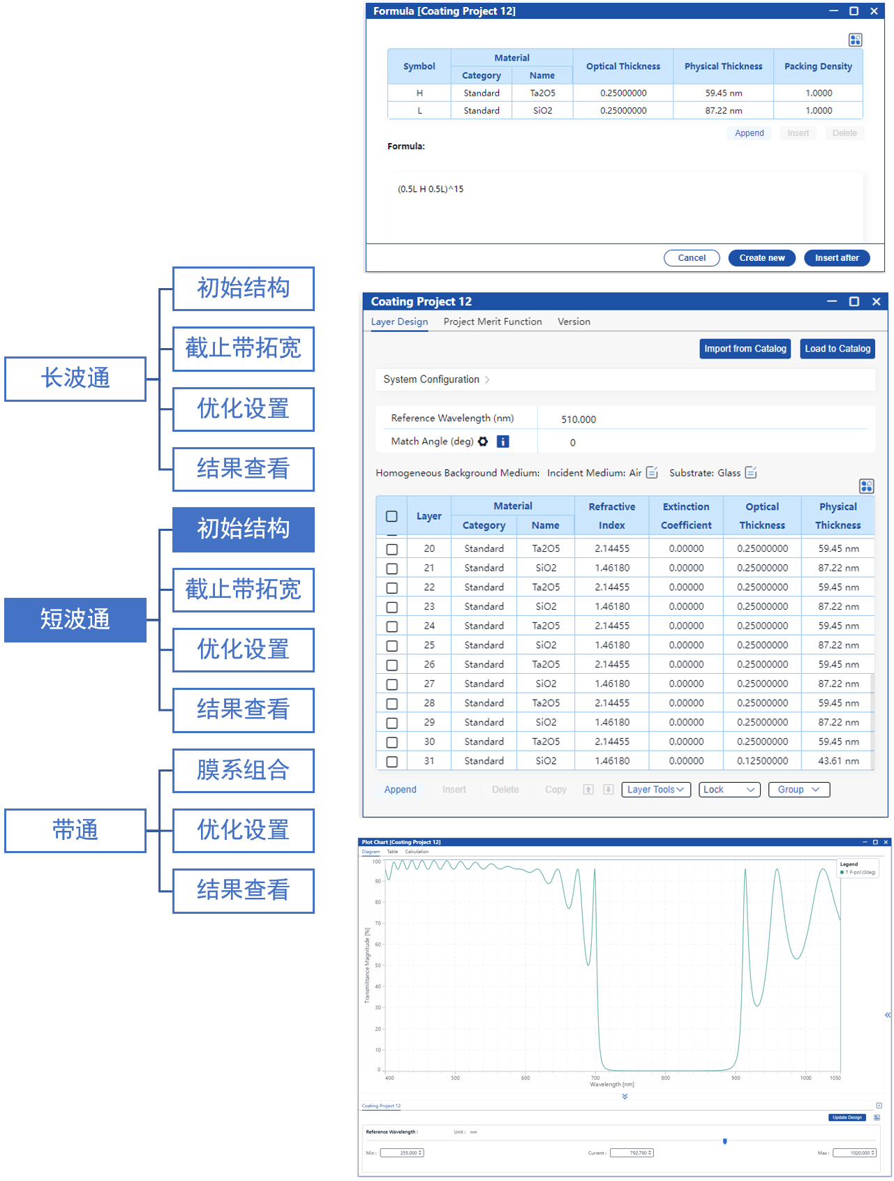 使用公式工具構建上述初始膜系,并查看其透射光譜。通過在圖表中動態調整參考波長,確定了最符合指標的截止帶范圍。但此時截止帶寬度仍不足,后續需要進一步拓寬截止帶寬度。