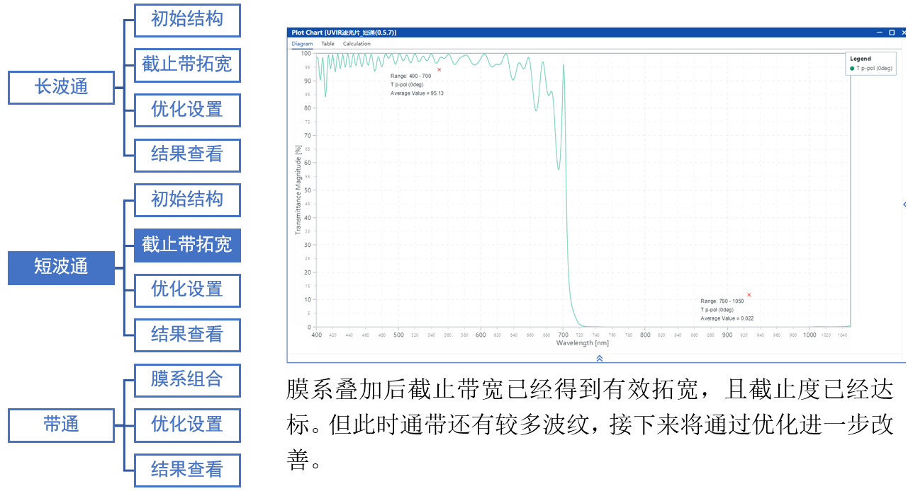 膜系疊加后截止帶寬已經得到有效拓寬,且截止度已經達標。但此時通帶還有較多波紋,接下來將通過優化進一步改善。