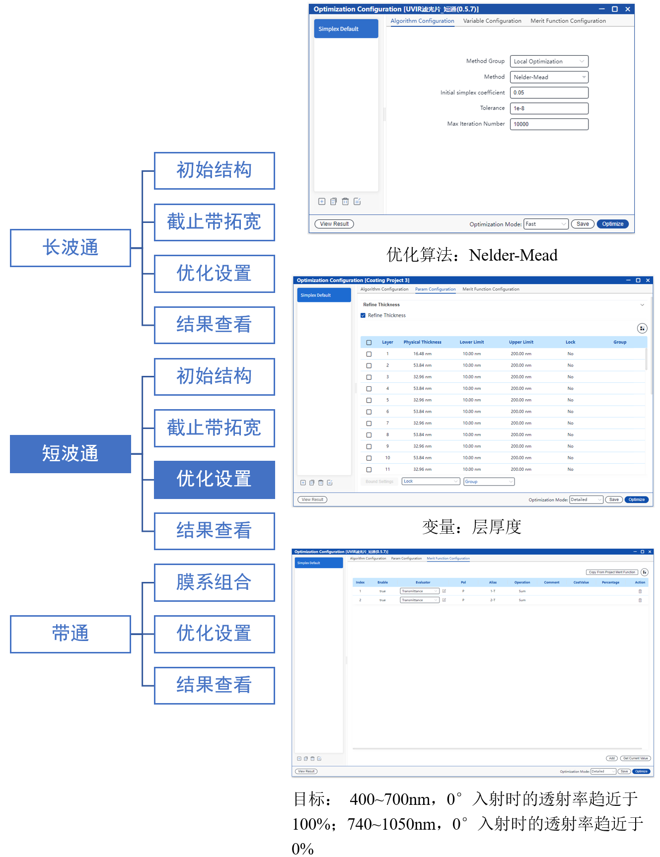 使用Nelder-mead算法優化各層厚度,目標是400~700nm波段透射率趨近于100%,740~1050nm波段透射率趨近于0%。