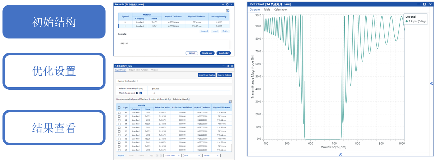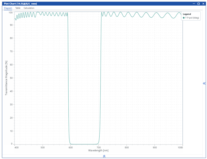 在本應用案例中,選用了常規的1/4波長堆棧作為初始結構。首先通過手動調整低折射率層和高折射率層的厚度,獲得截止位置和帶寬均符合要求的高反射區;隨后進一步優化膜層厚度,設計出一種負濾光片,其截止范圍為600–700 nm,通帶覆蓋400–590 nm和710–1000 nm。