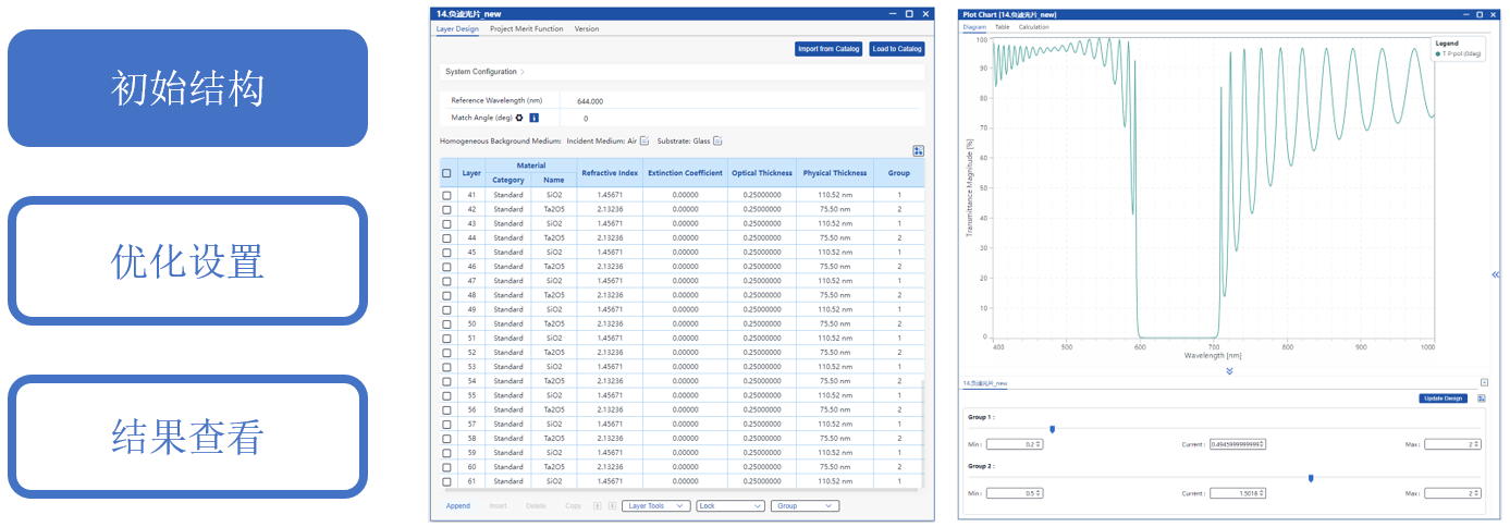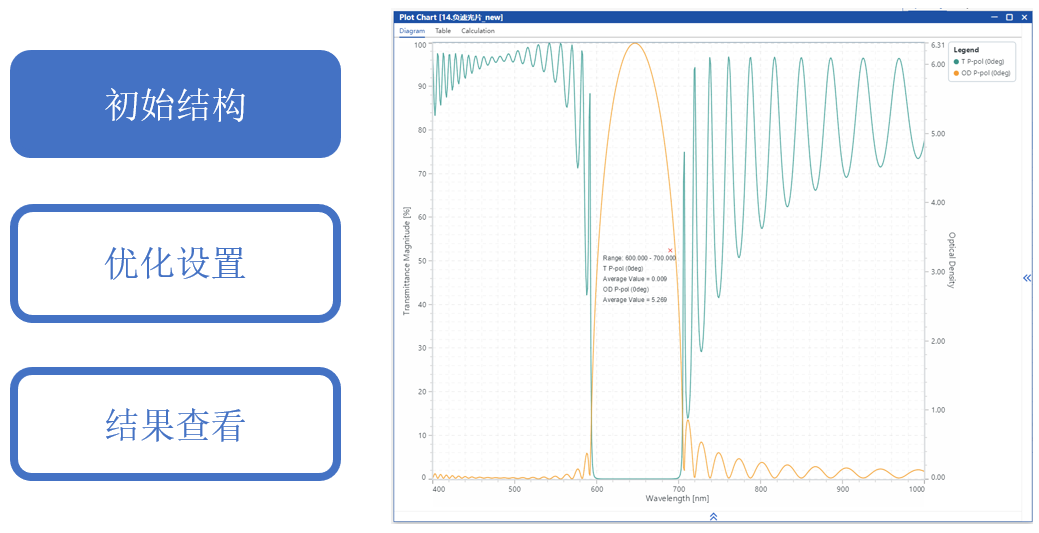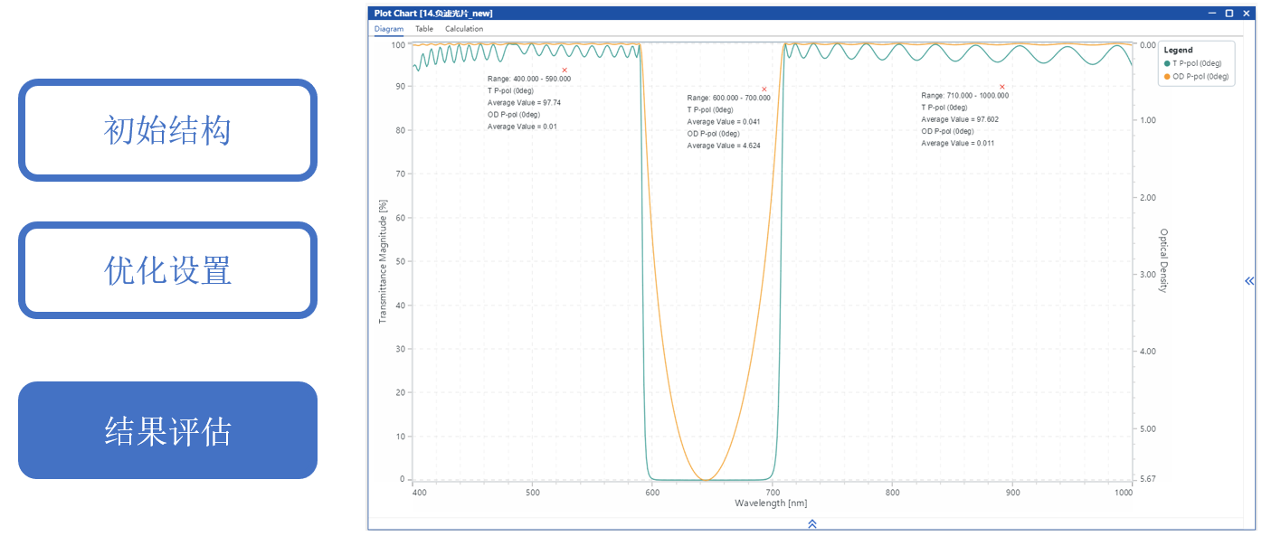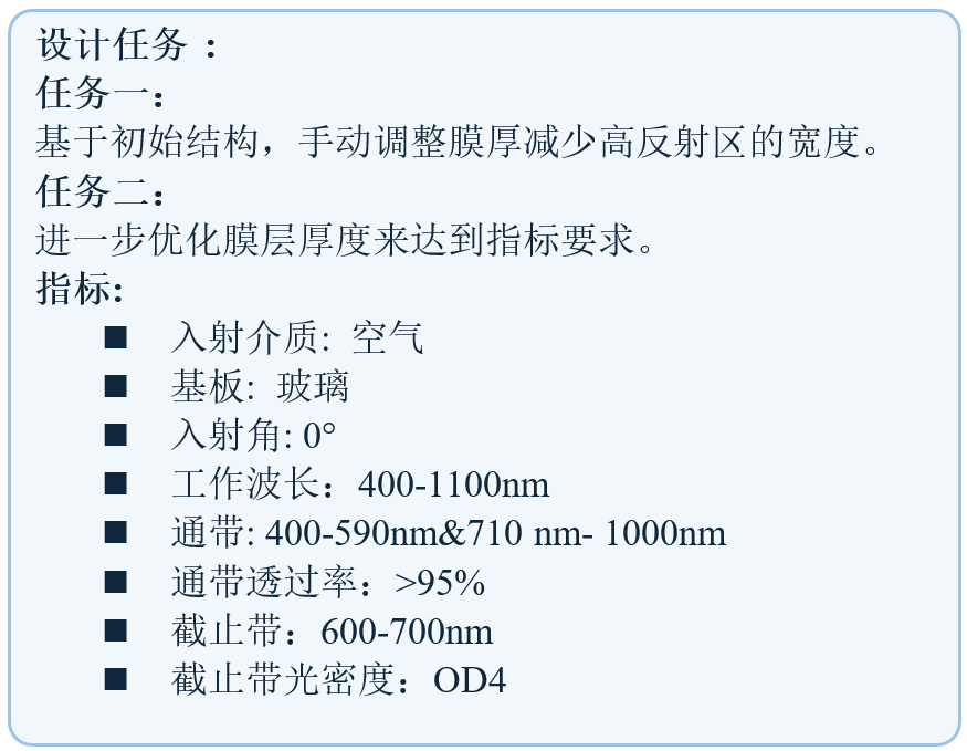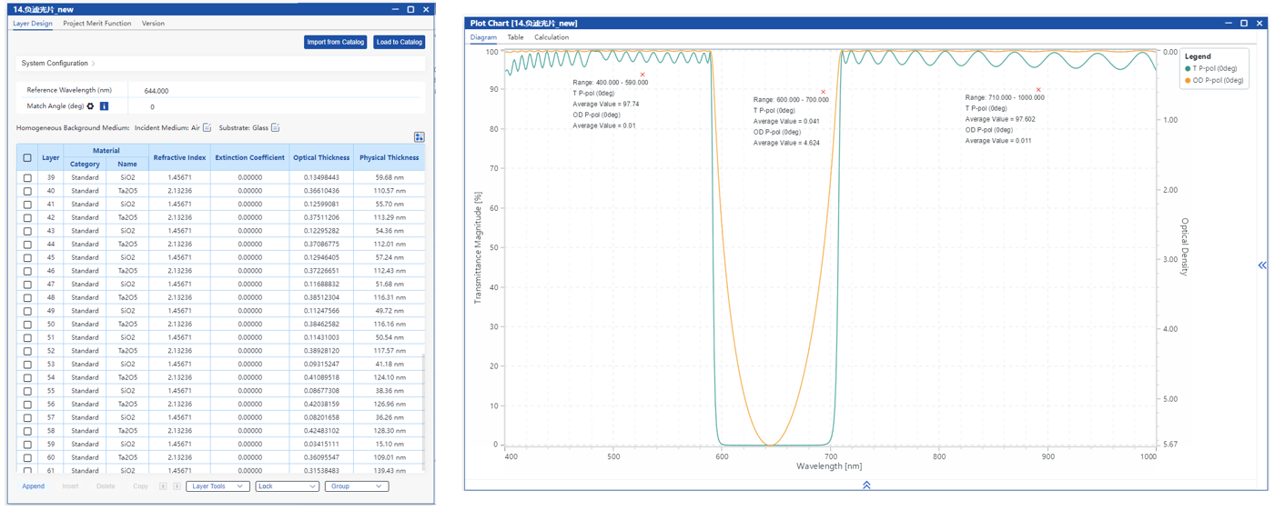 通過手動調整初始結構并優化層厚度,目標是在0°入射時,600-700 nm截止,平均光密度>4。400-590 nm和710-1000 nm透過,平均透射率>95%。