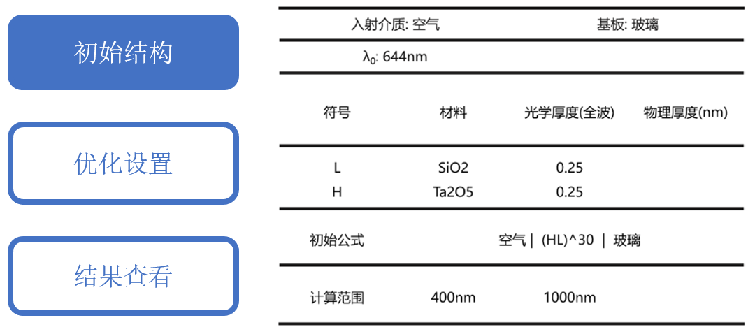 使用公式工具構建了上述膜系作為基礎結構,右圖展示了其在400-1000 nm內0°入射時的光譜。可以看出此時在的高反射區間相比指標較寬且透射波段有很多的波紋。