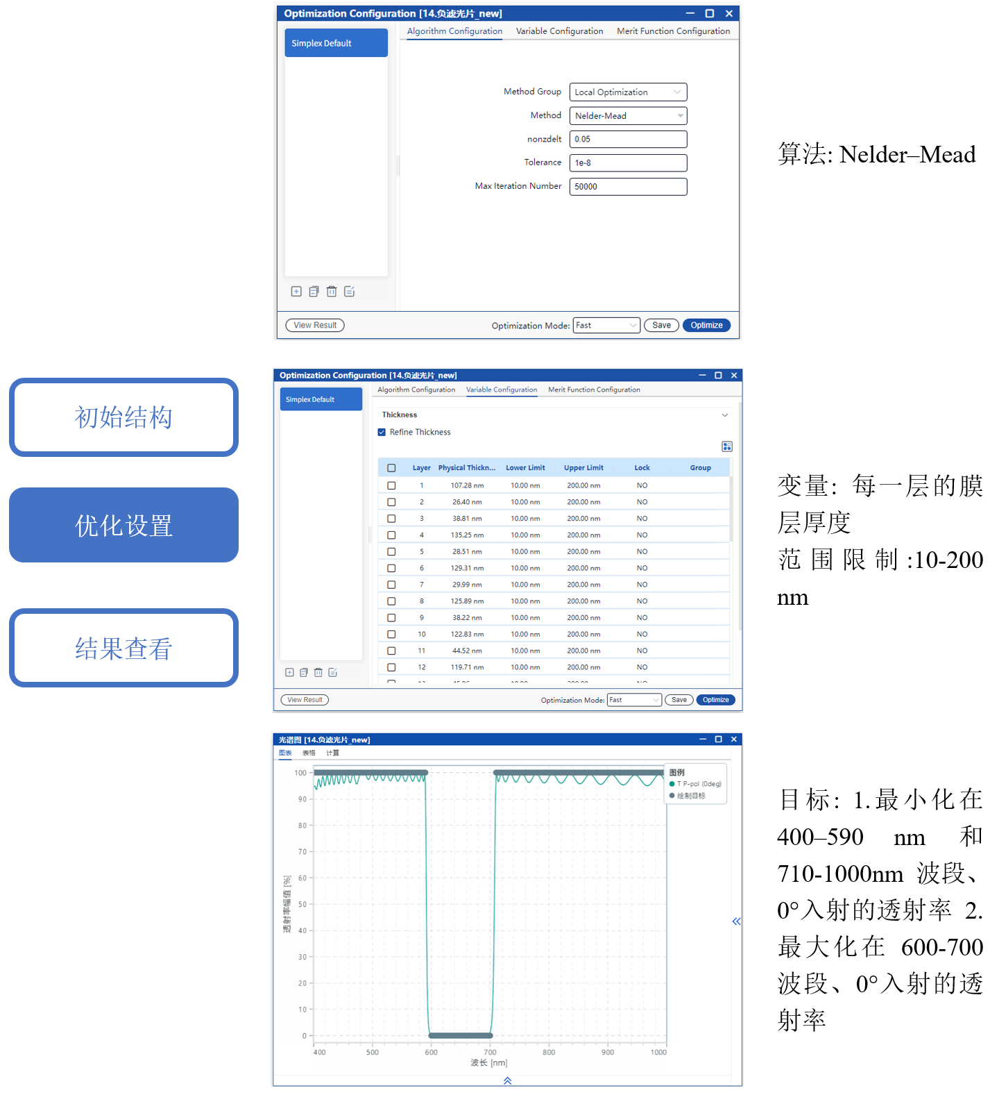 采用 Nelder-Mead 算法對各層厚度進行優化,目標是最大化通帶透射率同事最小化截止帶透射率。
