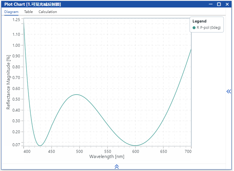使用公式工具構建了上述膜系作為基礎結構,右圖展示了其在可見光波范圍內0°入射時的光譜。可以看出此時在的反射率不達標