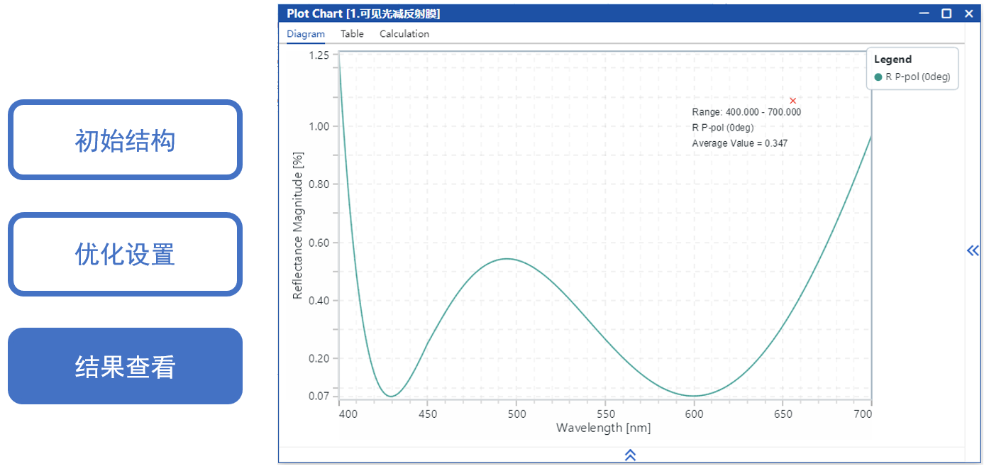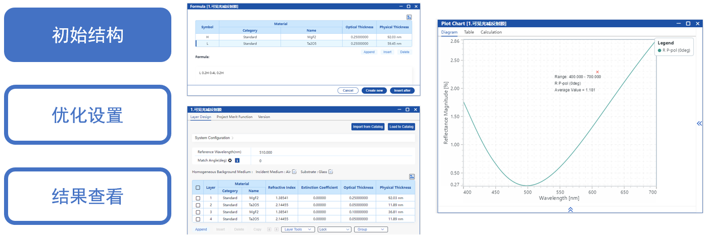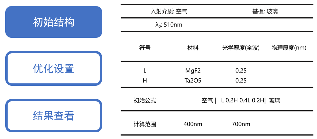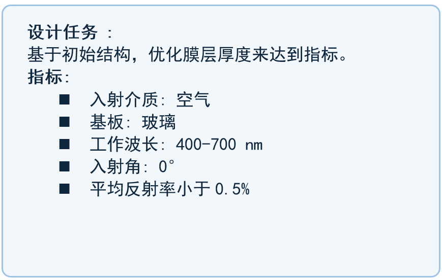 設計一個可見光減反射膜,通過優化初始結構的厚度,目標是在可見光范圍內0°入射條件下實現平均反射率低于0.5%。