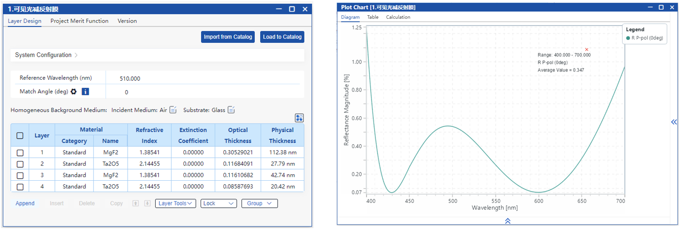 在本應用案例中,通過選用成熟的初始結構并對其厚度進行進一步優化,設計出一種在可見光波段具有優異減反射性能的鍍膜。