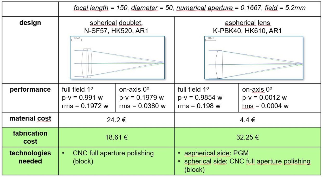 表格中綠色部分,顯示了PanDao分析結果。對于制造成本,非球面透鏡的成本比球面透鏡高1.7倍。但是如果考慮到材料成本,非球面解決方案的價格僅為球面透鏡的0.85倍。
