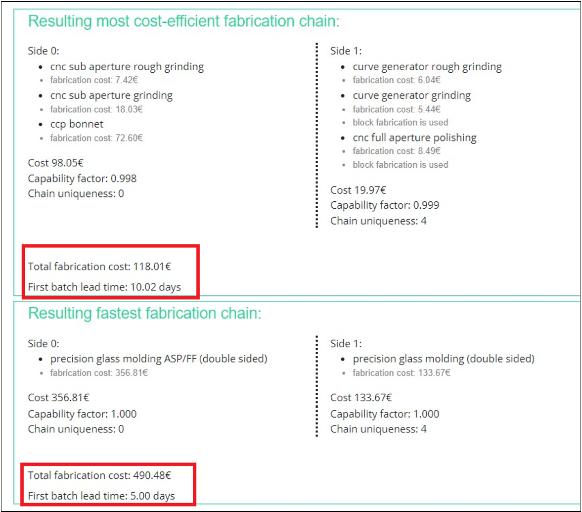 PanDao可以讀取ISO10110標準中描述的鏡頭參數和公差并考慮到360多種光學制造技術,以最低的成本,生成最優的制造鏈。因此,PanDao可以用于設計階段的成本影響分析,也可以用于優化供應鏈管理,例如確定最優供應商。